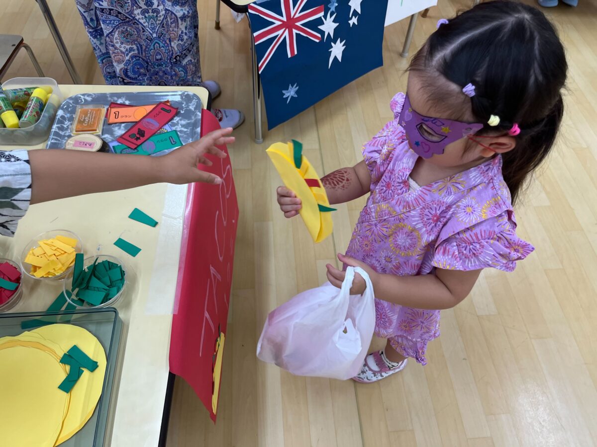 日本の金魚すくい、イタリアのカーニバルマスク、メキシコのタコスなど、子どもたちが画用紙や段ボールを使って手作りしたものを、クランテテのオリジナル通貨「クラン」で買うことができます。